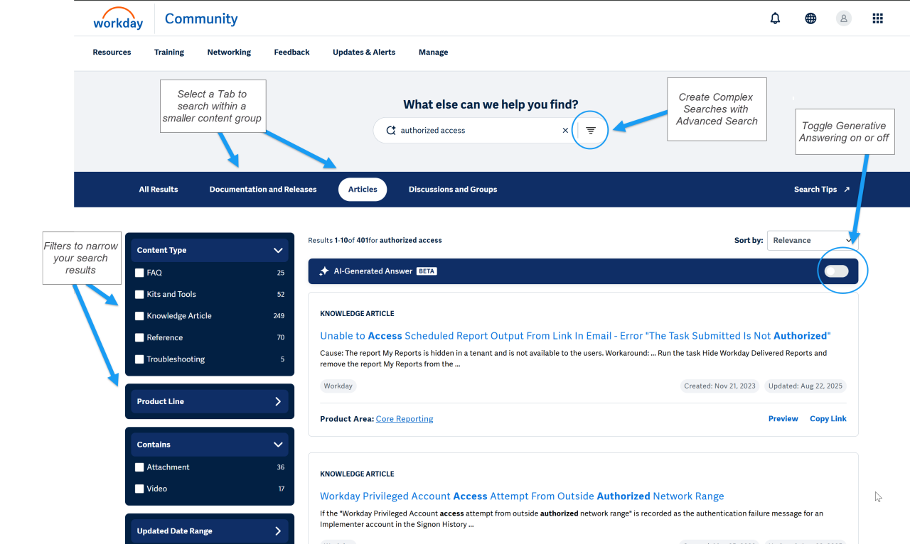 There are several powerful tools at your disposal in the Workday Community Search. Become familiar with the following 4 features: