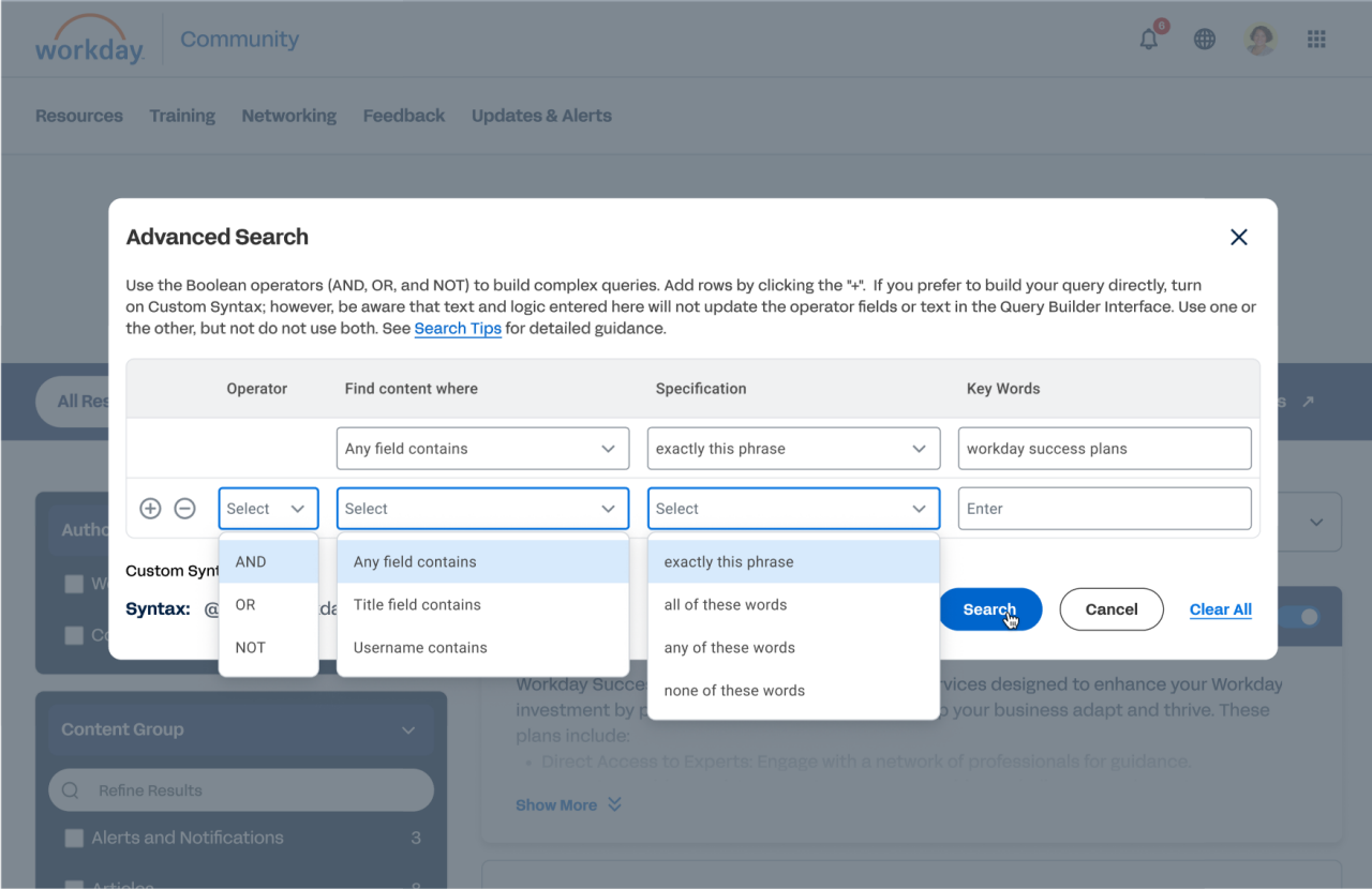 In January 2026, the Workday Community introduced an Advanced Search query builder, which replaces the need to learn the query syntax* that's necessary for complex queries with Boolean logic.